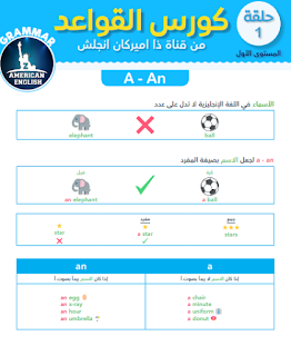 يحتوي كتاب استعمالات a, an وهو من كتب كورس القواعد من قناة zamericanenglish على الأساسيات المهمة في عملية تعلم الإنجليزية ويقوم الكتاب بعرضها بشكل سلس وسهل، ويقوم الكتاب بتوضيح كيف أن الأسماء في اللغة الإنجليزية لا تدل على عدد، ويبدأ بتوضيح كيفية وصف الاسم المفرد وذلك باضافة a أو an قبل الاسم ليدل على افراده والاحوال التي يستخدم فيها الحرف a وكذالك الأحوال التي يستخدم فيها an .