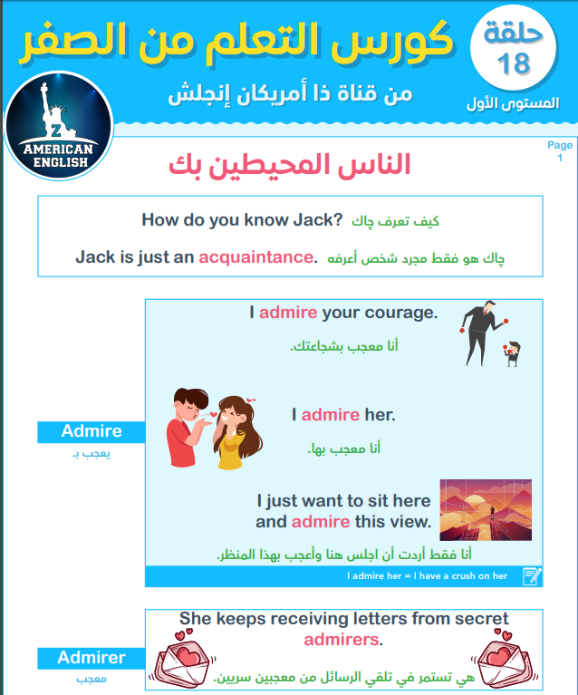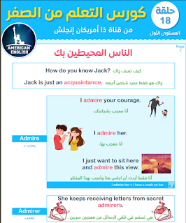 السلام عليكم موقع كتب تعلم الانجلزية هو منصة تعليمية من خلاله نقديم الكتب الالكترونية بصيغة بي دي أف مع ترك رابط تحميلها . و تعتبر هذه الطريقة ناجعة لأنها مجانية و الكتب الموجودة في الموقع تم الإشراف عليها من قبل مختصين في اللغة الانجليزية و في كتاب اليوم سنتعلم كيفية التواصل معى الآخرين بالغة الانجليزية.يشرح الدرس بعض الأسلة و أفعال جديدة مثل عل admire من ثم يقدم مفردات جديدة مثل roommate و تعني شركاء في الغرفة أوزميلك في الغرفة كذالك coworker/co-worker و تعني زميلك أو صديقك في العمل.كل هذا و أكثر تجدونه في درس اليوم للمؤلف ابراهيم عادل صاحب قناة zamericanenglish على موقع كتب تعلم الانجليزية بي دي أف مع ترك رابط تحميل pdf