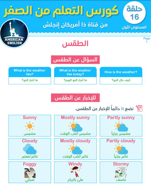 السلام عليكم كتاب اليوم مقدم من موقع كتب تعلم الانجليزية مع رابط تحميل بصيغة بي دي أف للمؤلف ابراهيم عادل الشهير بقناة zamericanenglish ويختص الدرس بالتعبير عن الطقس حيث يبدأ اولا بشرح طريقة السؤال عن حالة الجو و الإجابة والإخبار عنهما ثم يعتمد صور مرفقة بجمل مترجمة من الانجليزية الى العربية تصف حالة الطقس.كل هذا و أكثر تجدونه في كتاب اليوم تعلم الانجليزية للمبتدئين : الطقس برابط تحميلpdf