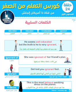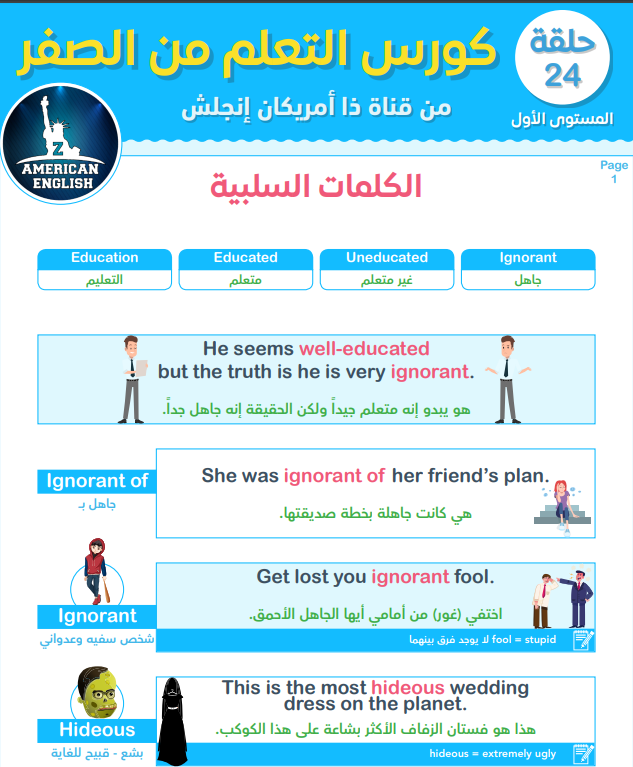 السلام عليكم يتحدث كتاب اليوم عن الكلمات السلبية في اللغة الانجليزية حيث يبدأ بشرح بعض الاوصاف مثل الجهل ignorance ثم يقوم بتوضيفهم في جمل مترجمة من اللغة الانجليزية الى اللغة العربية مع إستعمال صور تبين اكثر مقصد الجمل.تجدون المزيد من المعلومات و الكتب على موقع كتب تعلم الانجليزية بصيغة بي دي أف مع رابط تحميل pdf أسفل الفقرة.وينصح لكل راغب في تعلم الانجليزية بتحميل مجموعة كورسات تعلم الانجليزية من