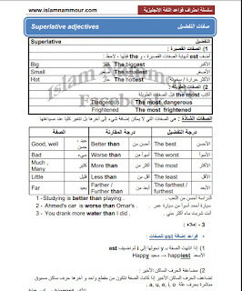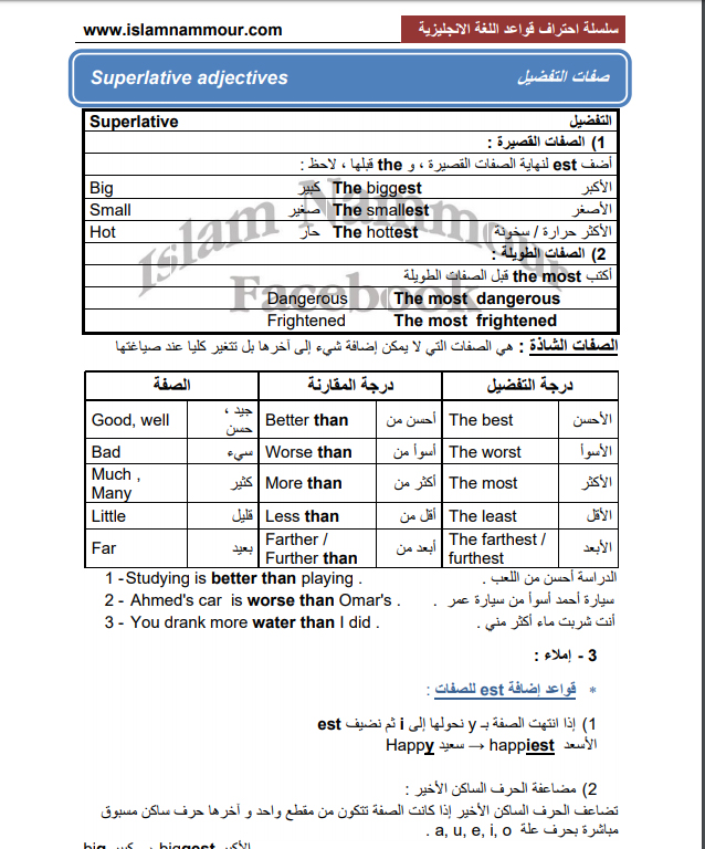 محتوى الكتاب: كتاب صفات التفضيل والماضي البسيط في اللغة الانجليزية هو كتاب إلكتروني من تأليف أستاذ اللغة الانجليزية اسلام نمور ويتكون من اثنتي عشر صفحة ويتوفر على موقع كتب تعلم الانجليزية بصيغة بي دي اف مجانا مع رابط تحميل مباشر أسفل الوصف. يحتوي الكتاب على جزء من أساسيات قواعد اللغة الانجليزية حيث يختص في البداية بصفات التفضيل من خلال شرح مفضل للصفات القصيرة والصفات الطويلة إضافة للصفات الشاذة وقواعد إدراج Estفي الكلمة لجعلها بصيغة التفضيل ومن ثم يقوم بتقديم نشاطات وتمارين تطبيقية لاختبار مدى الفهم بعدها ينتقل إلى كيفية استخدام were وwas في زمن الماضي البسيط فيشرح كل أداة على حدى في كيفية تكوين أسئلة باستخدام كلتا الأداتين سوآءا في صيغة الجمع أو صيغة المفرد وفي الصفحتين المواليتين يعطي مجموعة من التمارين والأنشطة وبعدها ينتقل إلى الجزء المخصص للماضي البسيط فيشرح صيغة فعل الماضي البسيط ومن ثم دلائله وقواعد التهجئة الخاصة به وفي كل مرة يقدم أنشطة وتمارين اختبارية تقيم مدى الفهم. ويختتم الكتاب ببعض المفردات المفيدة والرائعة التي لها علاقة بالشروحات السابقة حيث يقوم بجدولتها وتأطيرها مع إدراج الترجمة العربية الخاصة بكل كلمة على حدى وبشكل مخصوص.